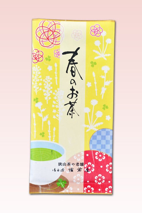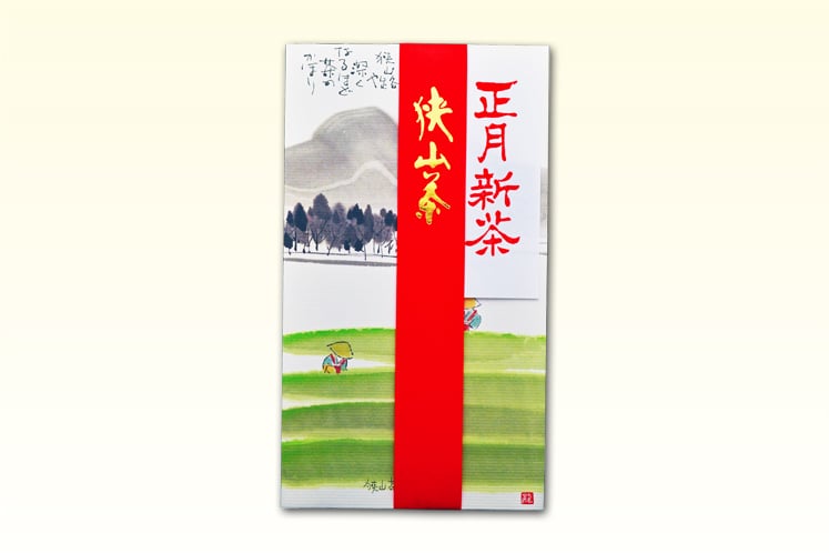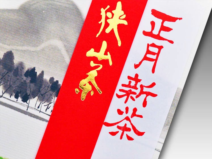 茶袋同様墨絵画家 又野達也氏デザインのアララギ袋。真紅の縦帯に「狭山茶」を箔押し…