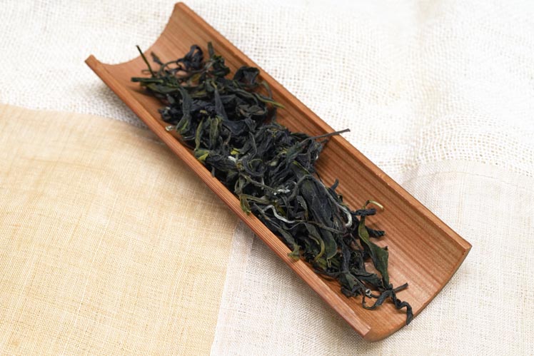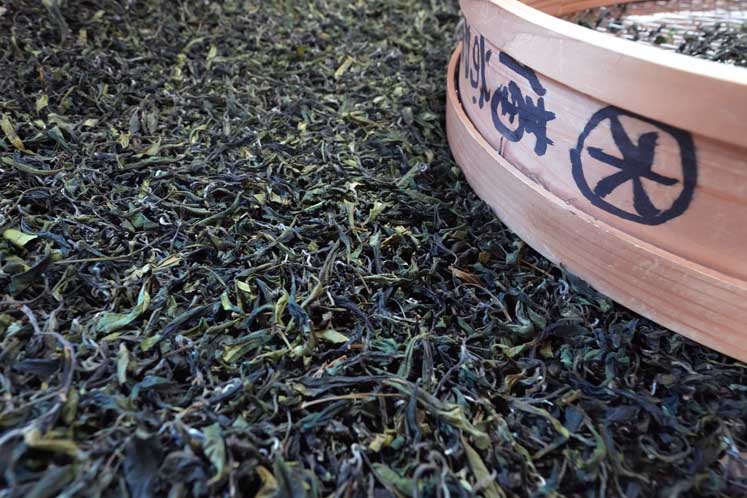 醗酵を伴わない釜炒り製緑茶は、微醗酵茶に比べ萎凋発揚に時間を要します。その分 水分含有率が減少するため、殺青・揉捻工程での制約が多く、大柄な外観に仕上ります。