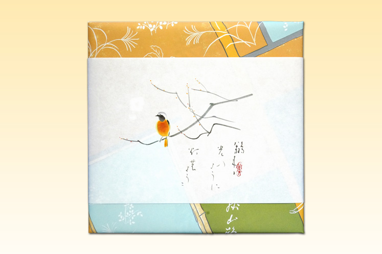 備前屋での進物には季節毎に掛け画を用意しています。主題は武蔵野の風情・・・ 11月末~12月下旬はジョウビタキで「ひたき来る 光のように 灯のように」・・・ 腹部のふかふか羽毛が濃い橙色で、何とも温かみのある印象です。12月末から1月は福茶の掛け紙に代わり、お年賀の風情を醸します。