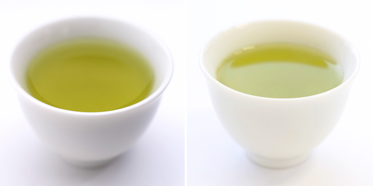 【水色比較】左:炭火入れ狭山茶、右:正月新茶