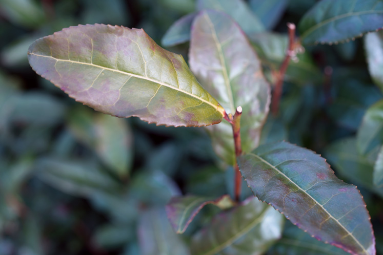 狭山の茶畑では真冬に茶葉が赤紫色を帯び、これを耐寒色とよびます