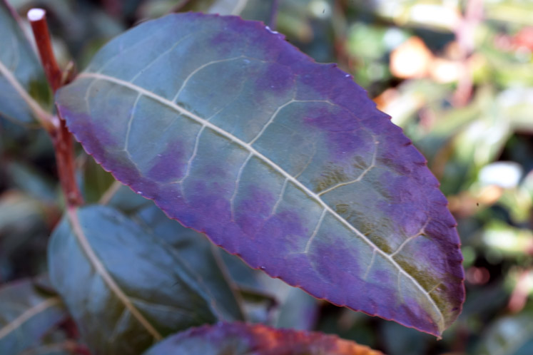 ほぼ中央の葉脈近くまで赤紫色になってきました